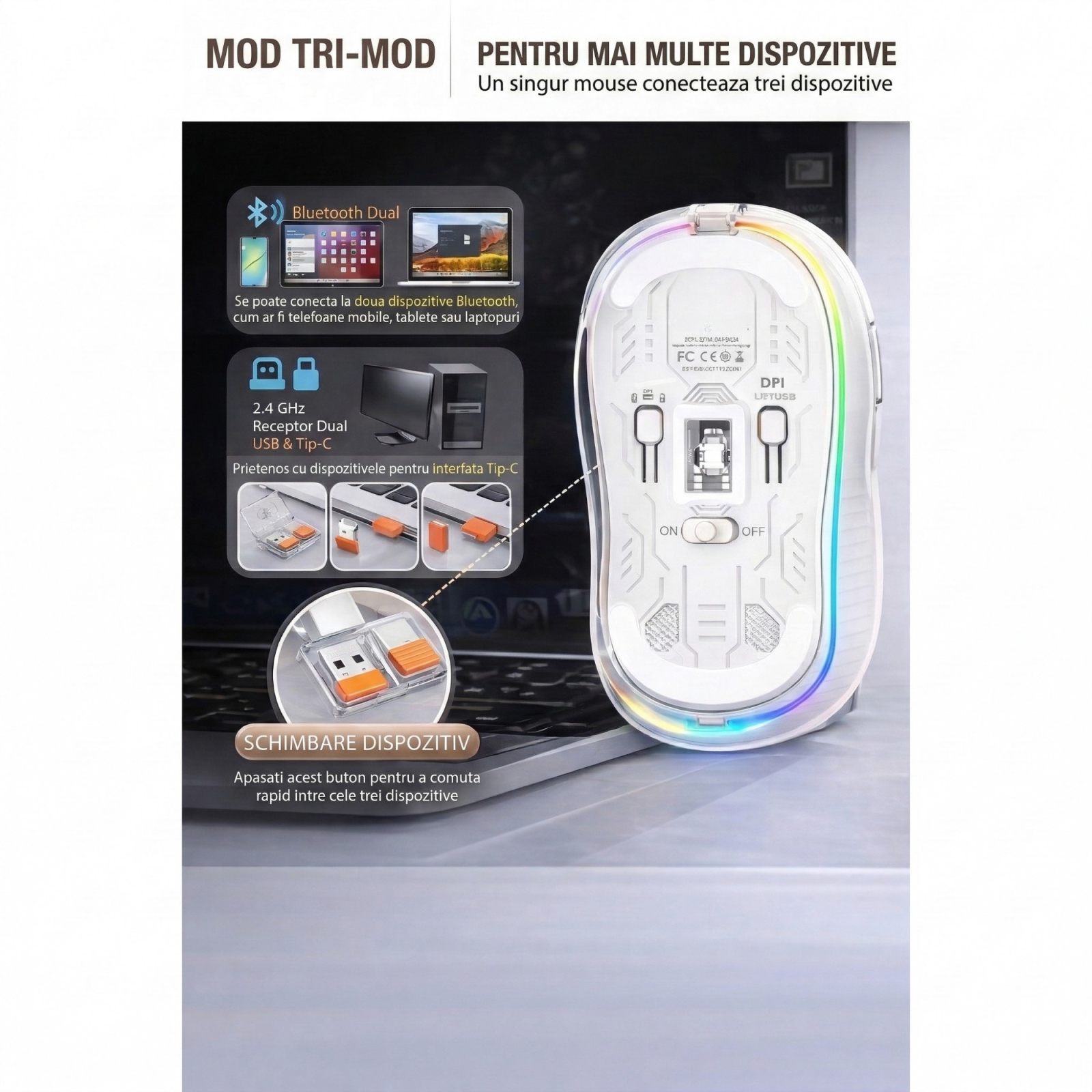 Mouse-ul wireless ofera conectivitate flexibila prin Bluetooth si receptor USB-C 2.4 GHz, facilitand utilizarea pe mai multe dispozitive. Este potrivit pentru activitati de birou, studiu sau lucru remote.