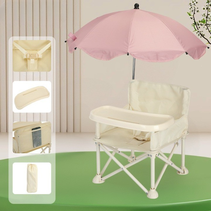 Scaun de masa pentru bebelusi si copii, multifuncțional, cu tavita si umbrela, bej si roz