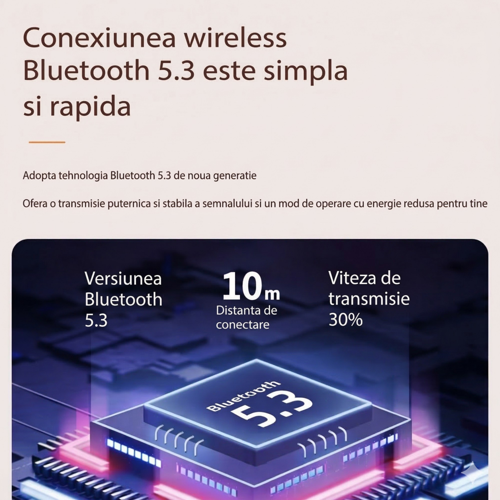 • Conectivitate rapida: Bluetooth 5.3 asigura redarea usoara a melodiilor preferate de pe dispozitive compatibile.