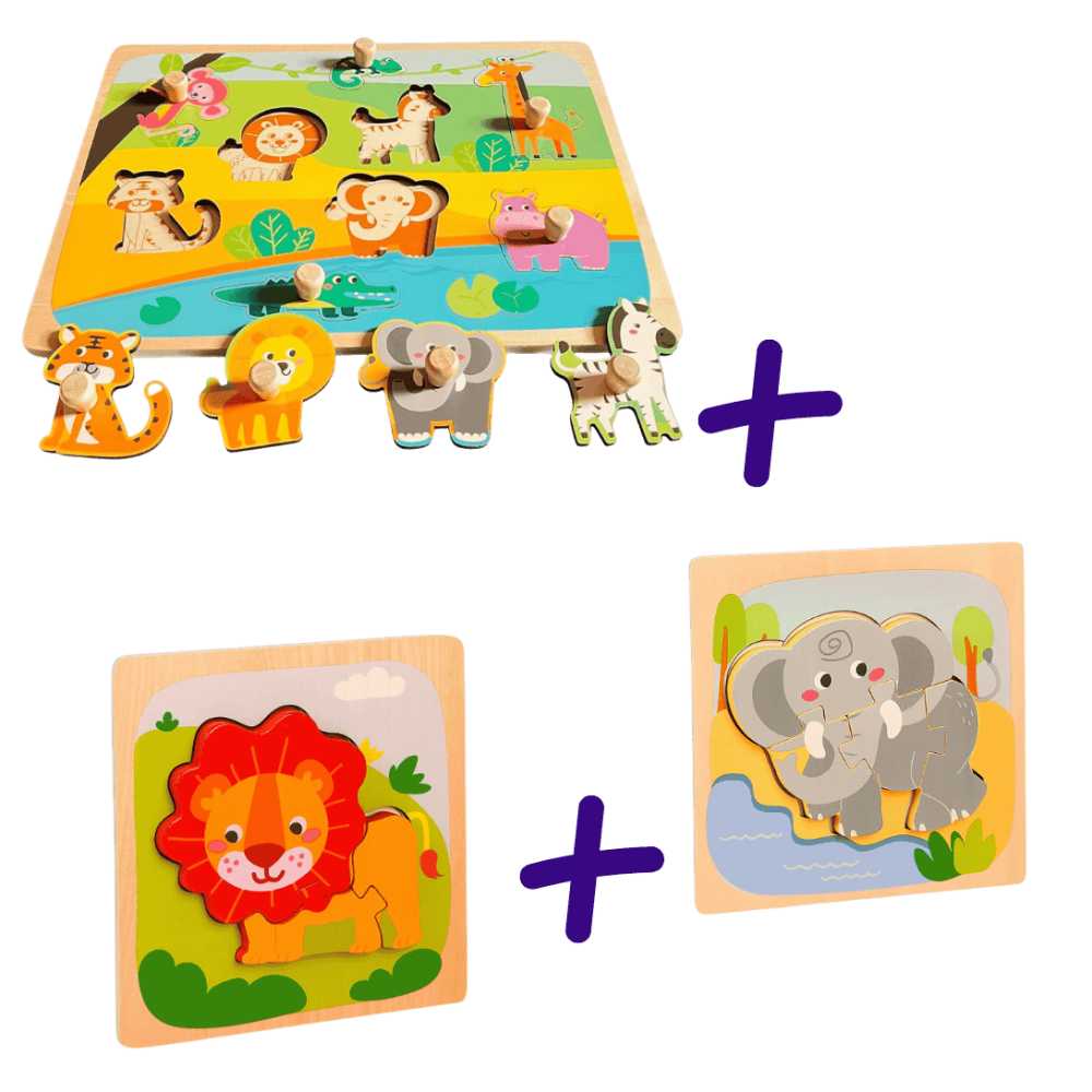 Setul include trei puzzle-uri din lemn, concepute pentru copii intre 0 si 3 ani, care stimuleaza dezvoltarea cognitiva si motrica prin joaca. Aceste articole ajuta la recunoasterea formelor, culorilor si animalelor, oferind o experienta educativa si creativa.
